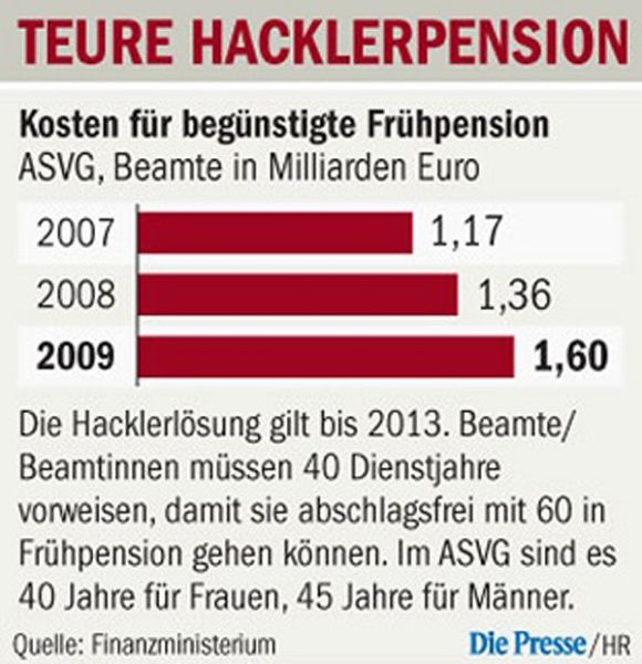 Nach Prognosen der PVA könnten bis zum Ende der Hacklerregelung 2013 sogar bis zu 15.000 Beamtinnen ins ASVG wechseln. Unter dem Strich würde das laut Berechnungen maximal zwölf bis 15 Milliarden Euro zusätzlich kosten.